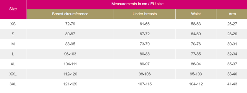 • Odzież uciskowa obejmuje całą górną część ciała do talii szerokim elastycznym pasem, zapobiegającym ocieraniu lub zwijaniu się odzieży
