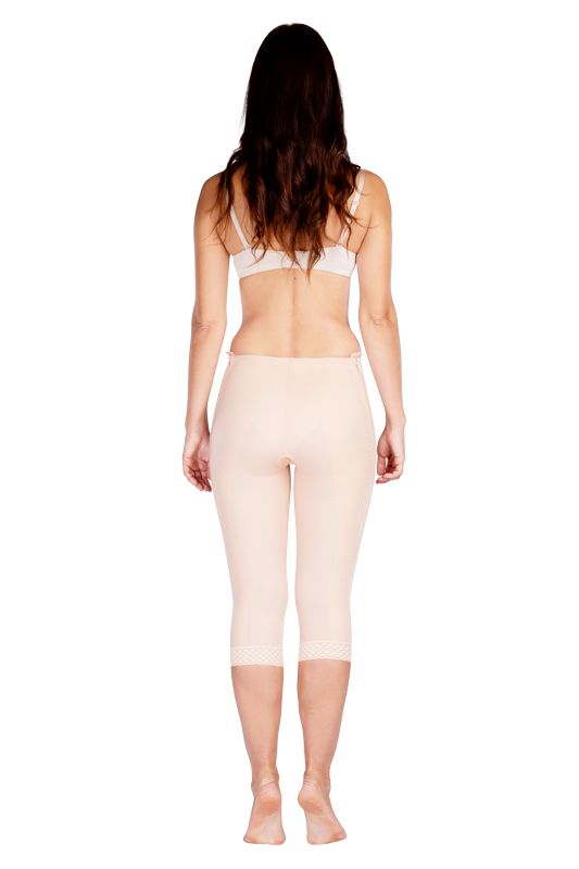 • Damska pooperacyjna odzież uciskowa; spodnie ¾, które są odpowiednie po liposukcji pośladków, bioder, ud lub kolan.