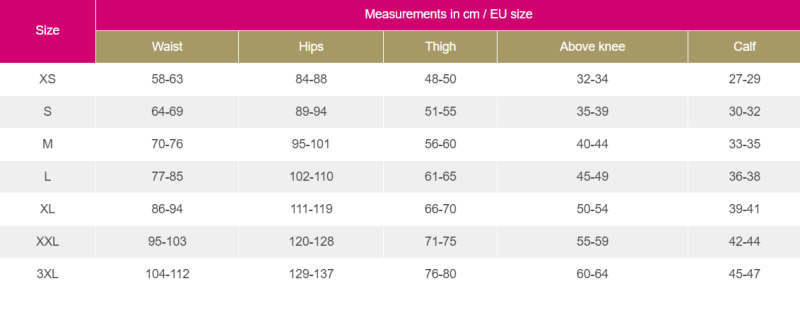 *Tabela rozmiarów dotyczy POMIARÓW PACJENTKI, a nie samego produktu (zatem produkt będzie mniejszy) i obliczony jest już właściwy ucisk (II klasa kompresji), zatem przy wyborze rozmiaru - proszę trzymać się ściśle tabeli.