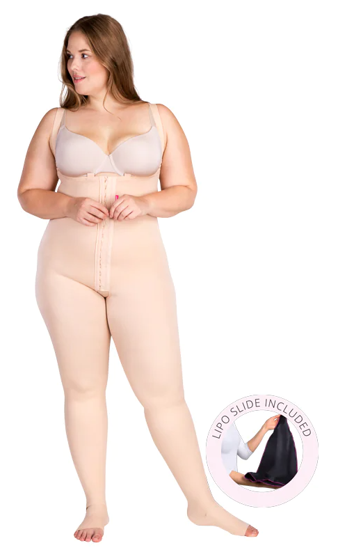 Pooperacyjna odzież uciskowa z długimi nogawkami, specjalnie zaprojektowana dla pacjentów cierpiących na lipodemię po liposukcji