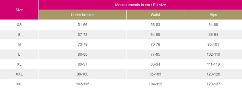 *Tabela rozmiarów dotyczy POMIARÓW PACJENTKI, a nie samego produktu (zatem produkt będzie mniejszy) i obliczony jest już właściwy ucisk (II klasa kompresji), zatem przy wyborze rozmiaru - proszę trzymać się ściśle tabeli.